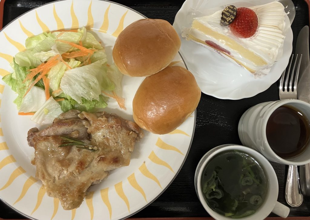 #チキンステーキ#サラダ#ワカメスープ#ロールパン#ショートケーキ